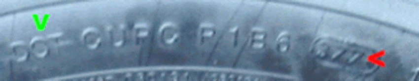 Auf dem unteren Bild ist bspw. die Zahl 377 zu erkennen. Dies bedeutet, dass der Reifen in der 37. Woche des Jahres '97 hergestellt wurde.