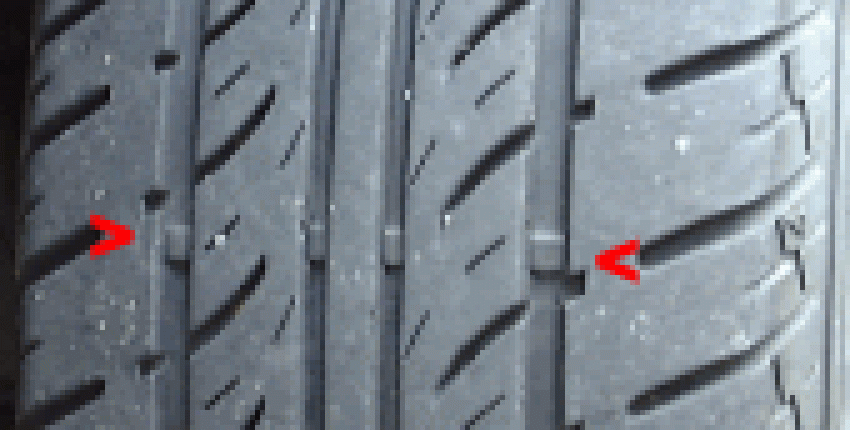 Folgt man dem Pfeil, findet man zwischen dem Profil der Lauffläche kleine Stege, an denen man erkennen kann, ob die gesetzlich vorgeschriebene Mindestprofiltiefe von 1,6 mm unterschritten wird.