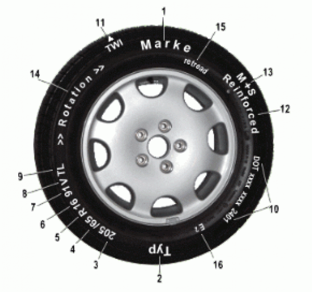 Ob Neureifen oder runderneuerter Reifen - jeder Reifen muss das Herstellungsdatum aufweisen. Runderneuerte Reifen tragen auf ihrer Flanke zusätzlich die Angabe 'R', 'runderneuert', 'retread' (vgl. Bild) oder entsprechende Bezeichnungen.