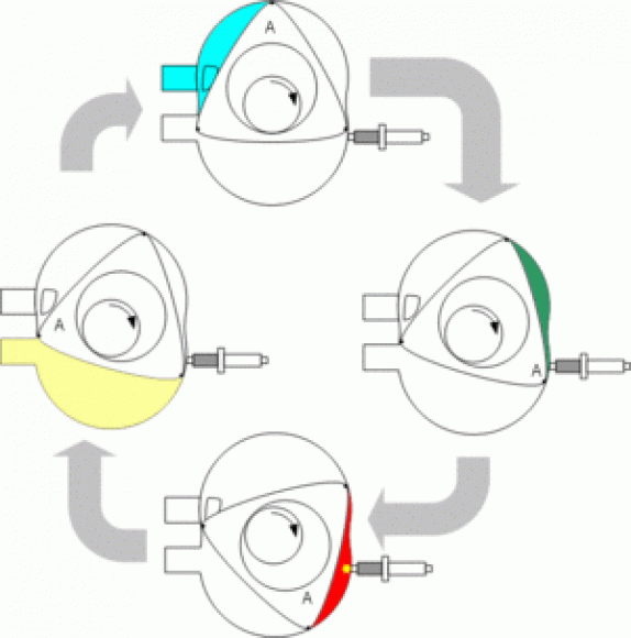 Der Wankelzyklus: Einlass (blau), Kompression (grün), Zündung (rot), Auslass (gelb)